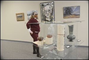 The exhibit features 14 past and present Ukrainian-American artists whose works are in a variety of media, including oil and acrylic painting, ceramic pieces, sculpture, religious icons, gourd work, and print.